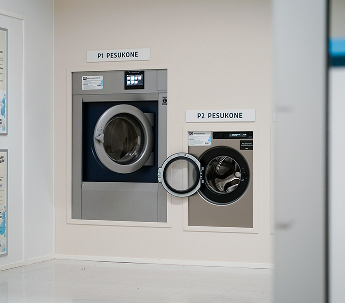1. Täytä kone sopivalla määrällä pyykkiä. Kone on täysi, kun pyykin ja rummun väliin jää 5-10cm tila. 2. Sulje luukku huolellisesti. 3. Siirry maksupäätteelle, jossa valitset käyttämäsi laitteen numeron (pesukoneet on merkitty tunnuksilla P1 ja P2) 4. Maksa kortilla, lähimaksulla tai mobiilimaksulla. 5. Siirry takaisin koneelle. Valitse pesuohjelma koneen ohjauspaneelista ja käynnistä kone.