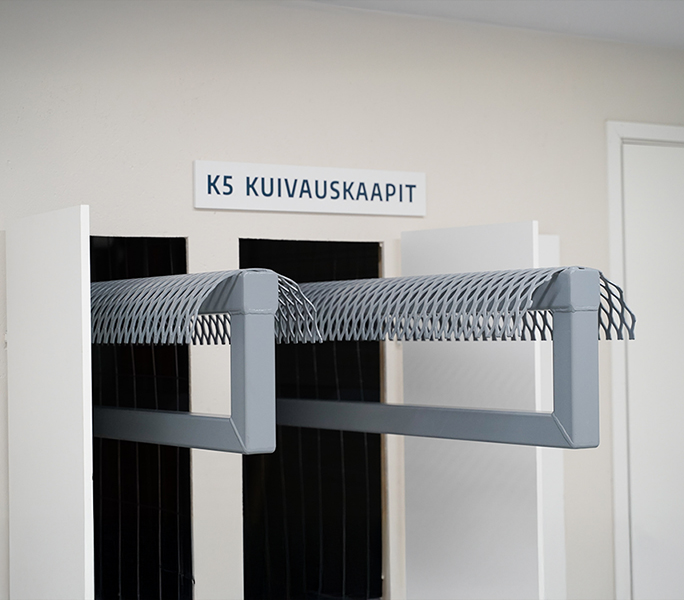 1. Ripusta märät matot tai muut suuret tekstiilit kuivauskaapin ulosvedettävälle rekille. 2. Lukitse kaapin ovi. 3. Siirry maksupäätteelle, jossa valitset kuivauskaapit (kaikki kaapit on yhdellä tunnuksella K5). 5. Maksa kortilla, lähimaksulla tai mobiilimaksulla.