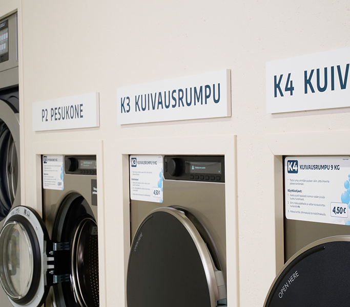 1. Valitse kuivausrumpu ja aseta pyykit tasaisesti rummun sisään. 2. Sulje luukku. 3. Siirry maksupäätteelle, jossa valitset käyttämäsi laitteen numeron (kuivausrummut on merkitty tunnuksilla K3 ja K4) 4. Maksa kortilla, lähimaksulla tai mobiilimaksulla. 5. Siirry takaisin koneelle. Valitse sopiva kuivausohjelma ja käynnistä kone.